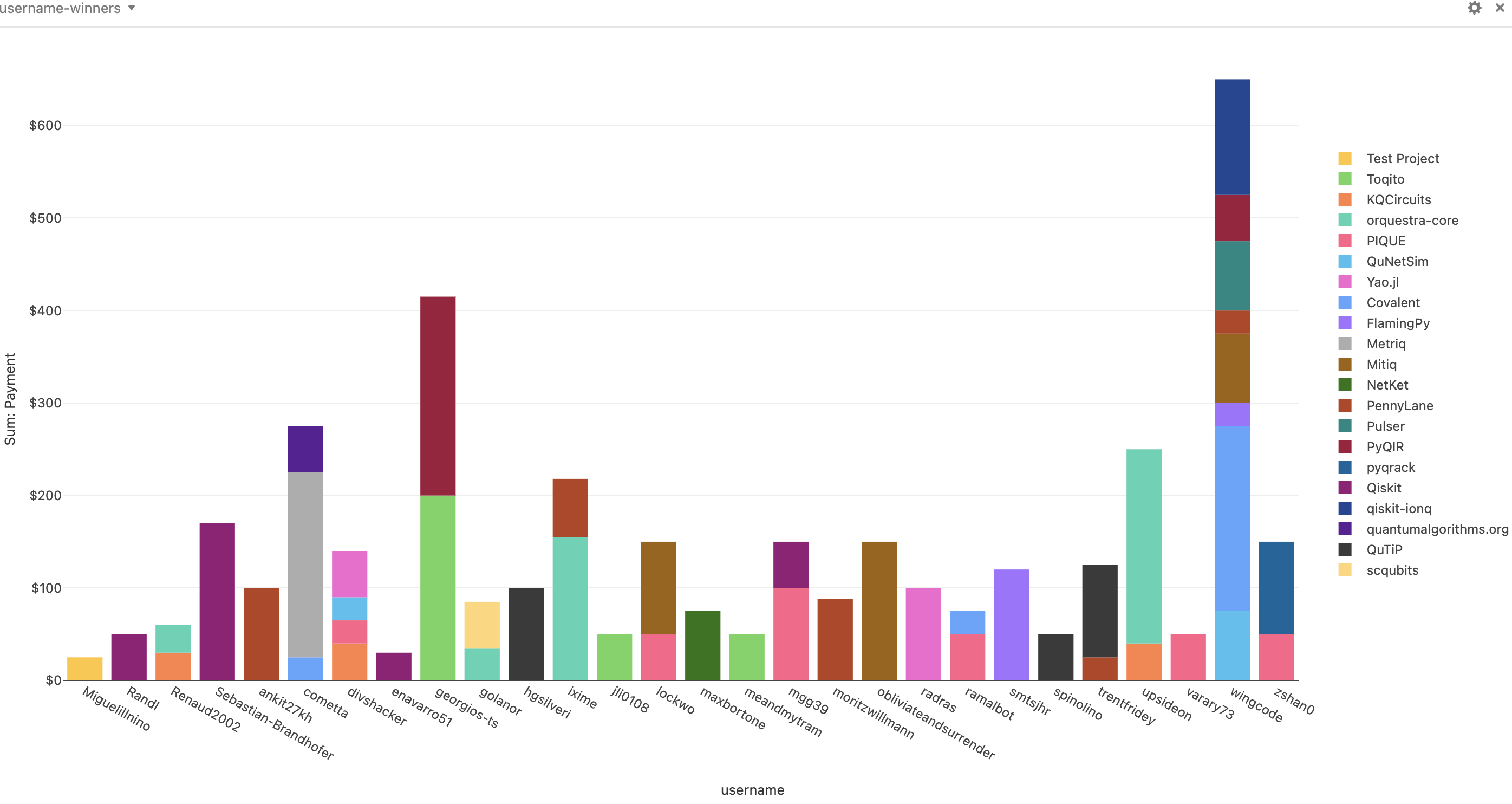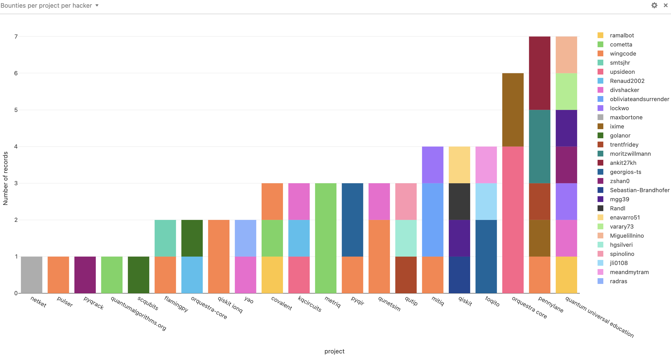 30 projects from the quantum open source ecosystem participated in unitaryHACK 2022, with the support of over 45 maintainers. We had over 400 participants in unitaryHACK 2022. Over 73% of participants were either at their first quantum or open source event. Over 63 bounties were made during unitaryHACK 2022 by 27 hackers. More stats and graphics are below:
